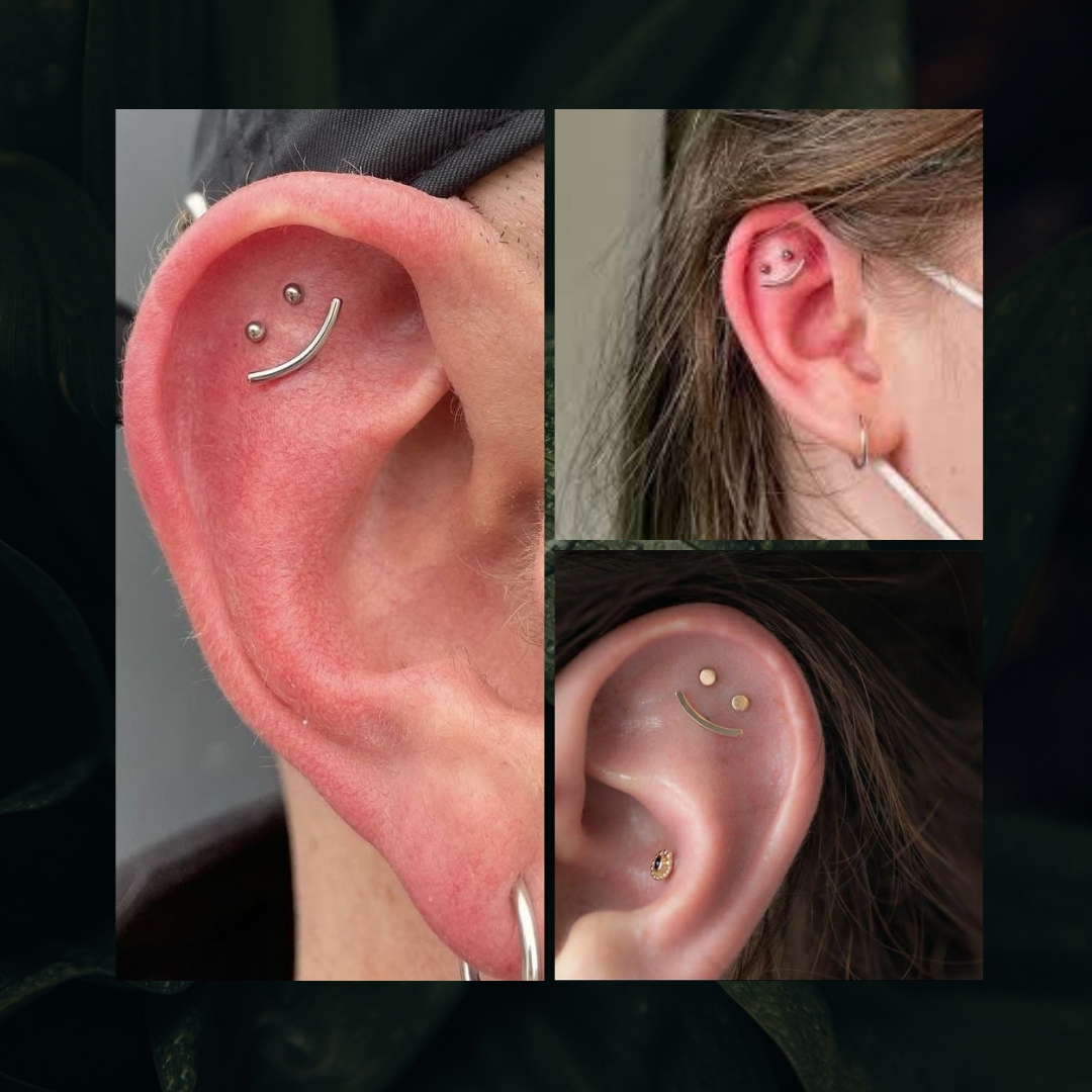 Three Flat Helix piercings with jewelry that look like a smiley face.
